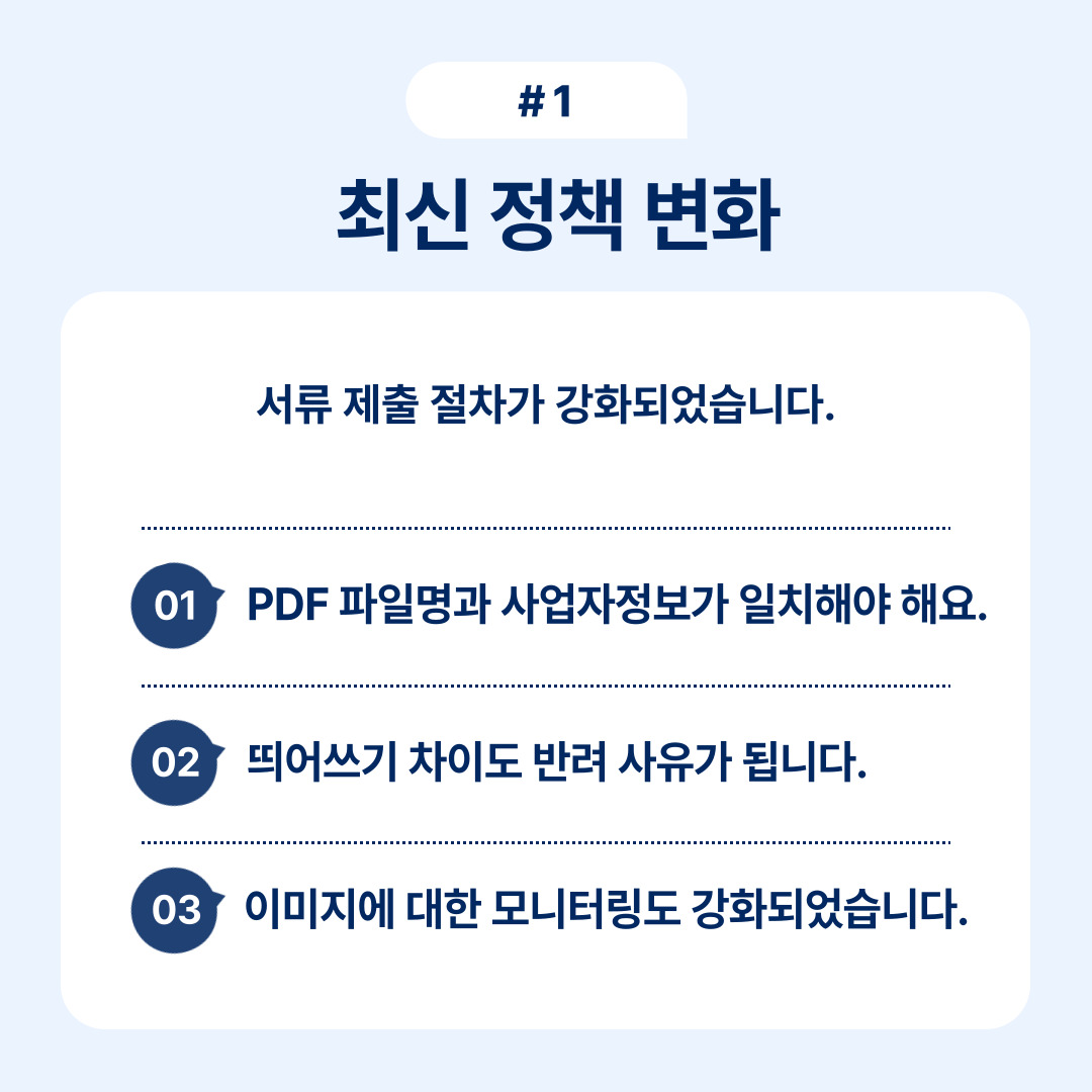 가장 중요한 변화는 PDF 파일명과 사업자정보가 완전히 일치해야 한다는 점입니다. 작은 오탈자나 띄어쓰기 차이도 반려 사유가 되며, 이로 인한 등록 지연은 기회비용 손실로 이어집니다.
