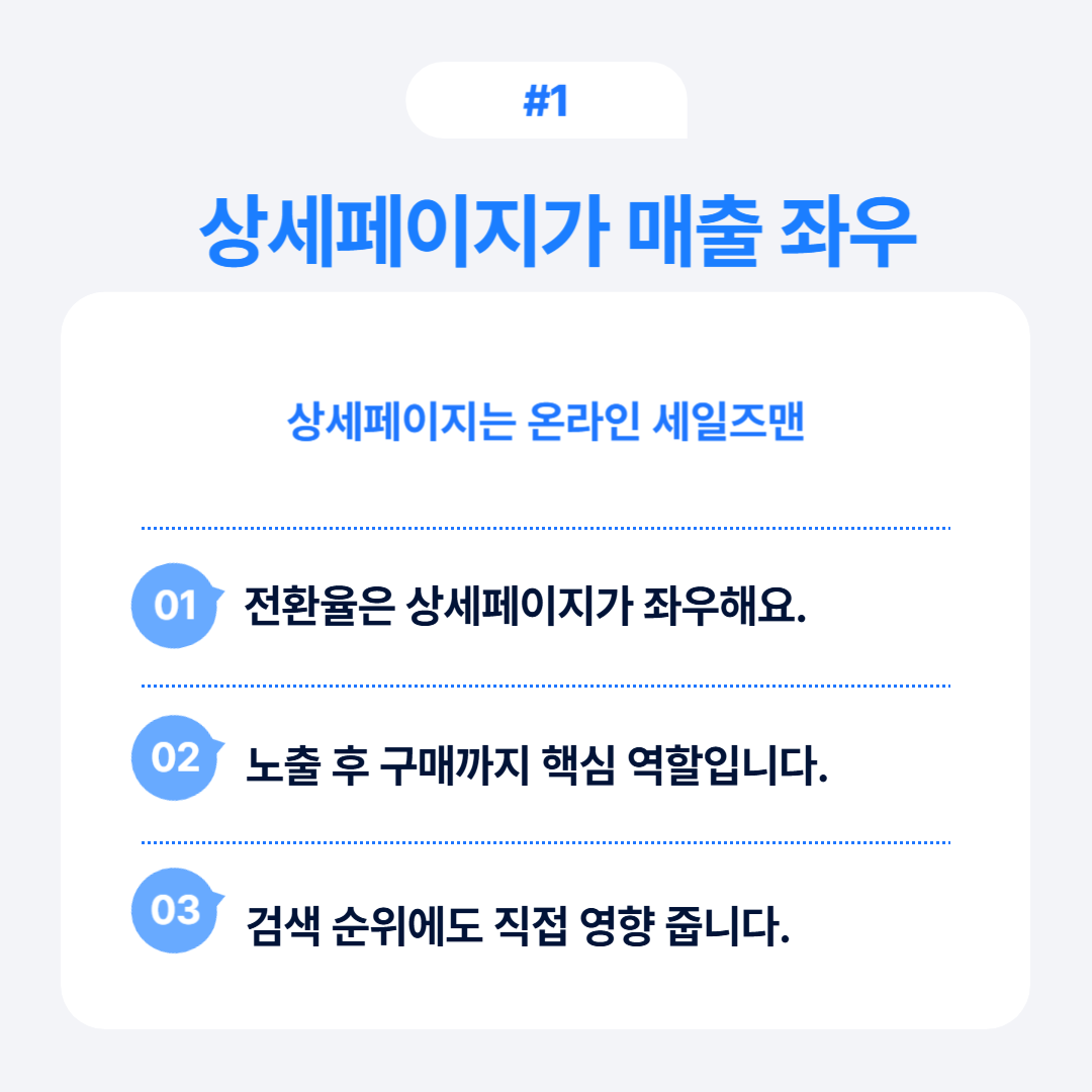 상세페이지는 단순한 정보 전달 공간이 아닙니다. 온라인에서 고객과 만나는 유일한 접점이자 세일즈맨으로, 상품 노출에서 구매 전환까지 가장 중요한 다리 역할을 합니다.