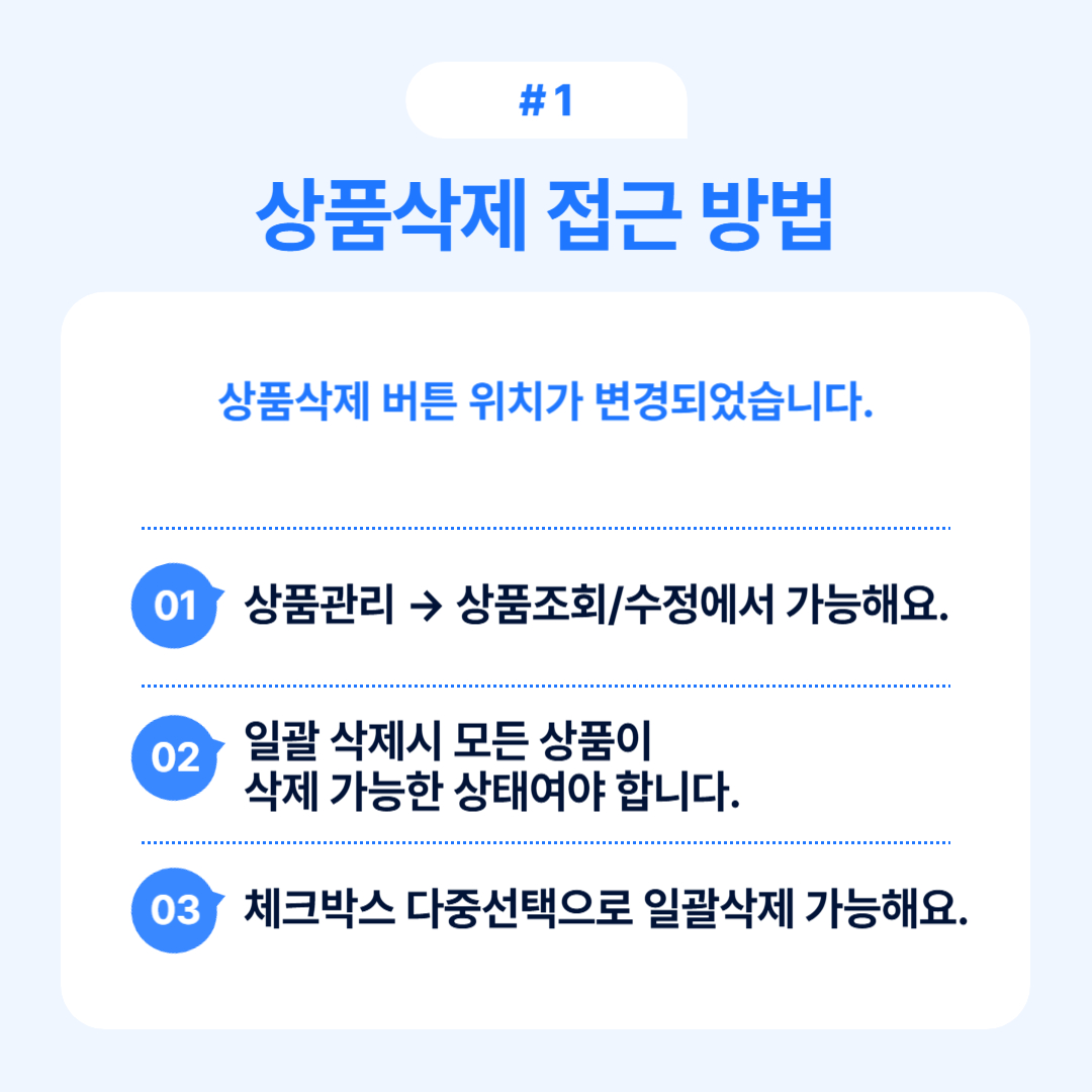 - 필터링: ‘상품관리 → 상품조회/수정’에서 삭제 가능한 상품만 필터링합니다.
