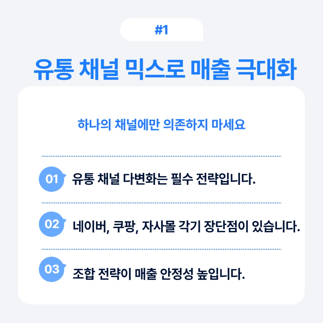 예를 들어, 쿠팡에서 성과가 좋더라도 네이버와 자사몰을 병행 개발해 리스크를 분산하는 것이 중요합니다.