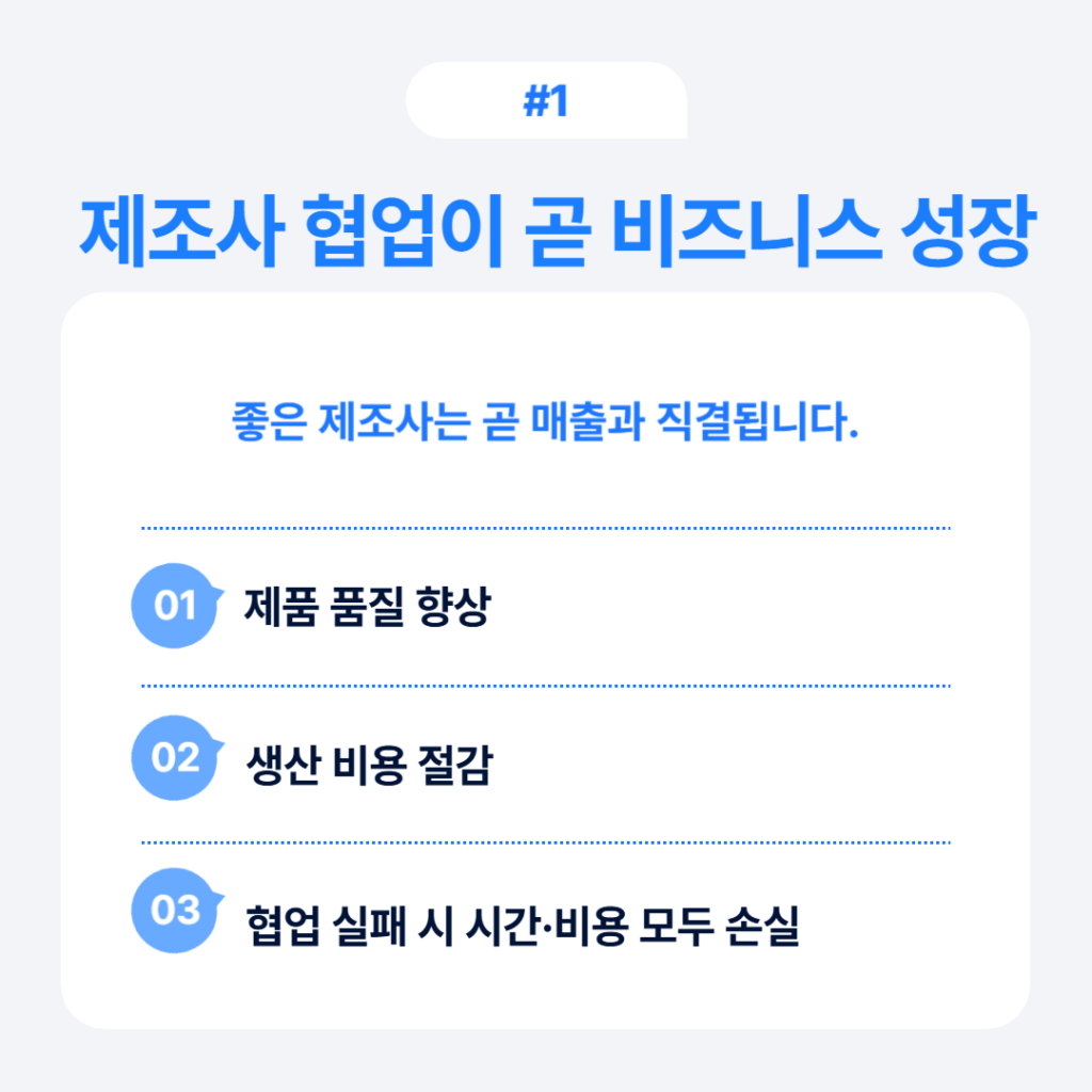 제조사 협업은 단순한 거래 관계를 넘어 비즈니스 성장의 핵심 요소입니다. 좋은 제조사와 협업하면 제품 품질이 향상되고 생산 비용이 절감됩니다. 반면 잘못된 협업은 비용 낭비와 시간 손실로 이어집니다.